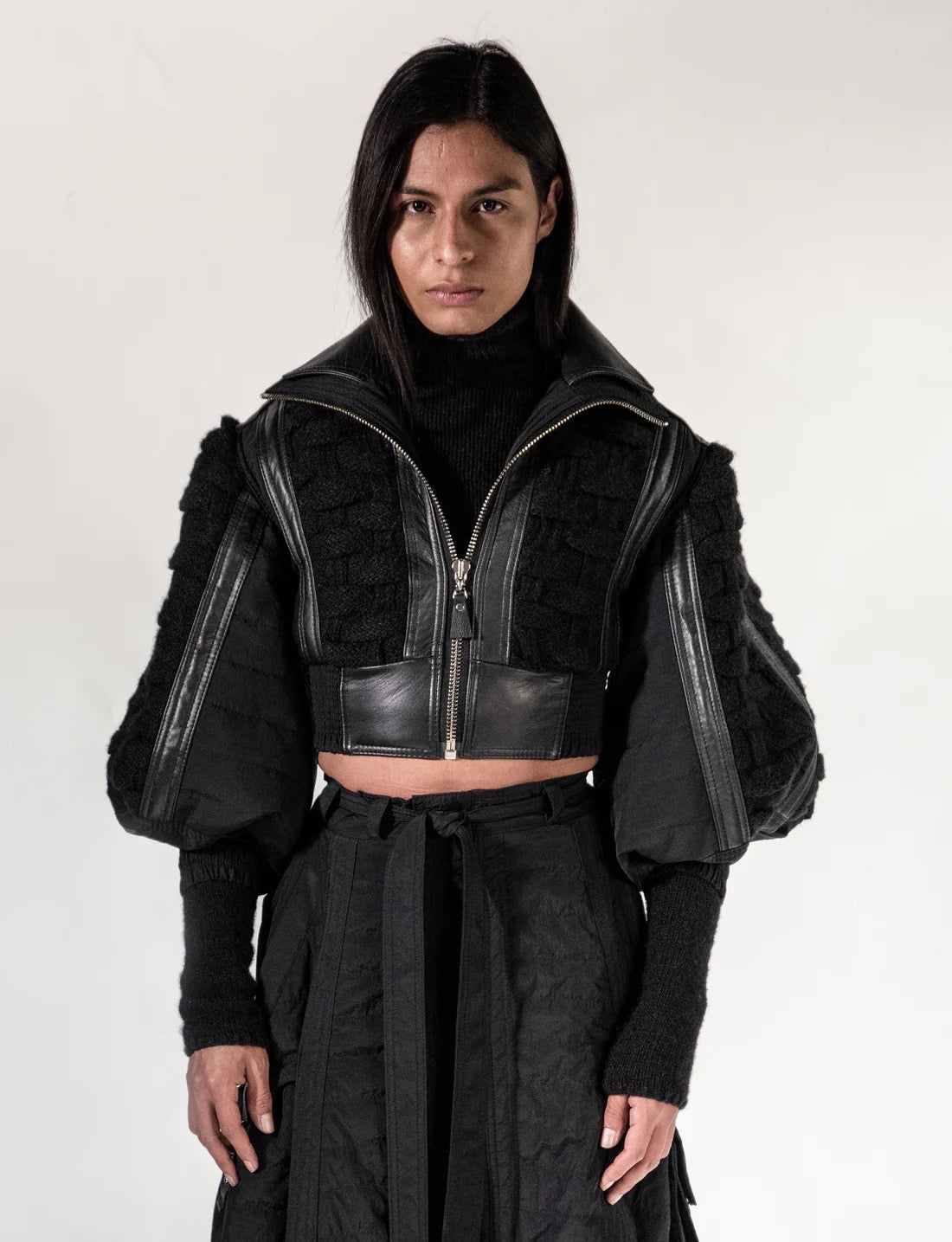Short jacket in slim silhouette with balloon sleeves, hand knitted in two needles.