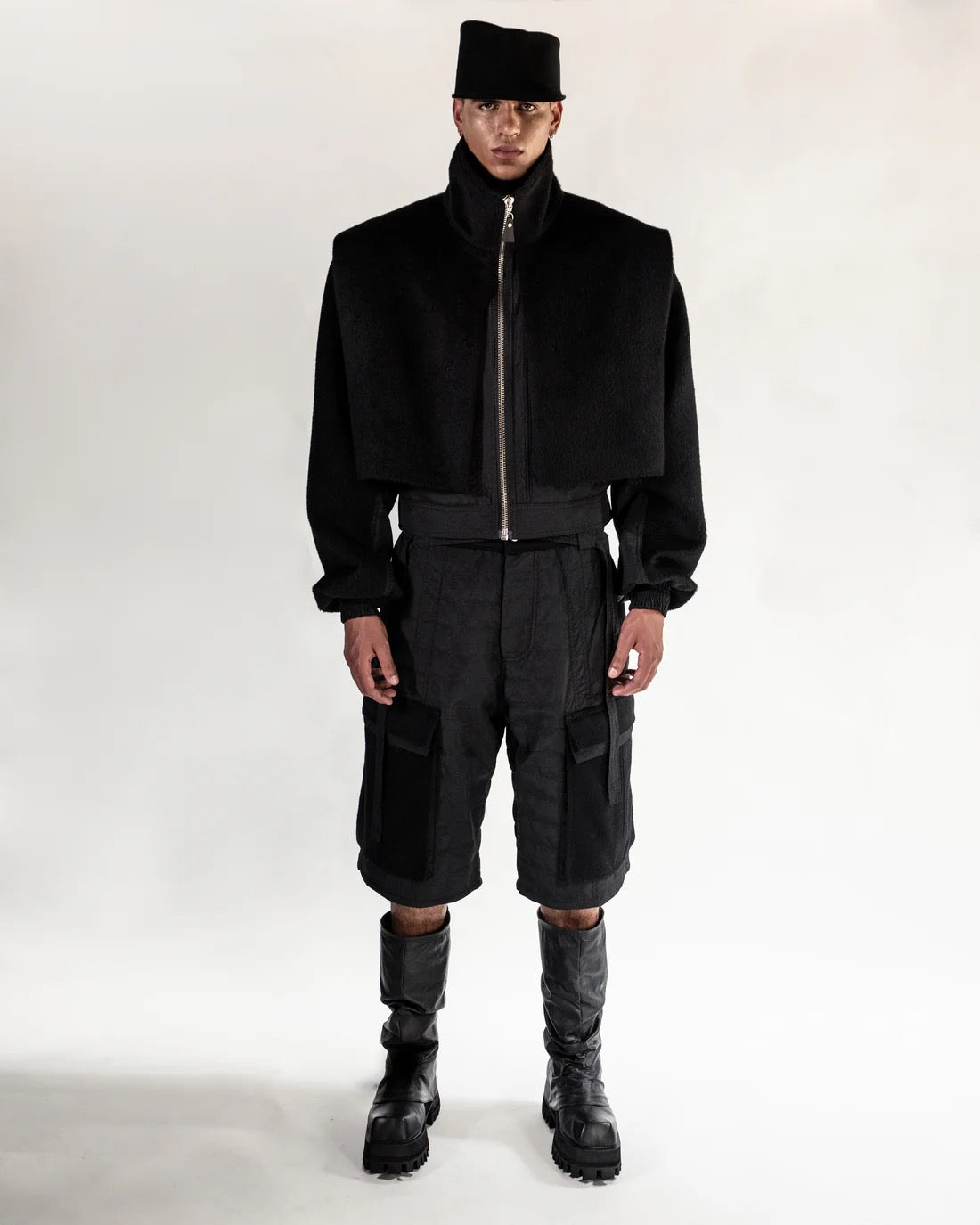 Jacket inspired by the silhouette of the traditional poncho, with high collar made of alpaca cloth.