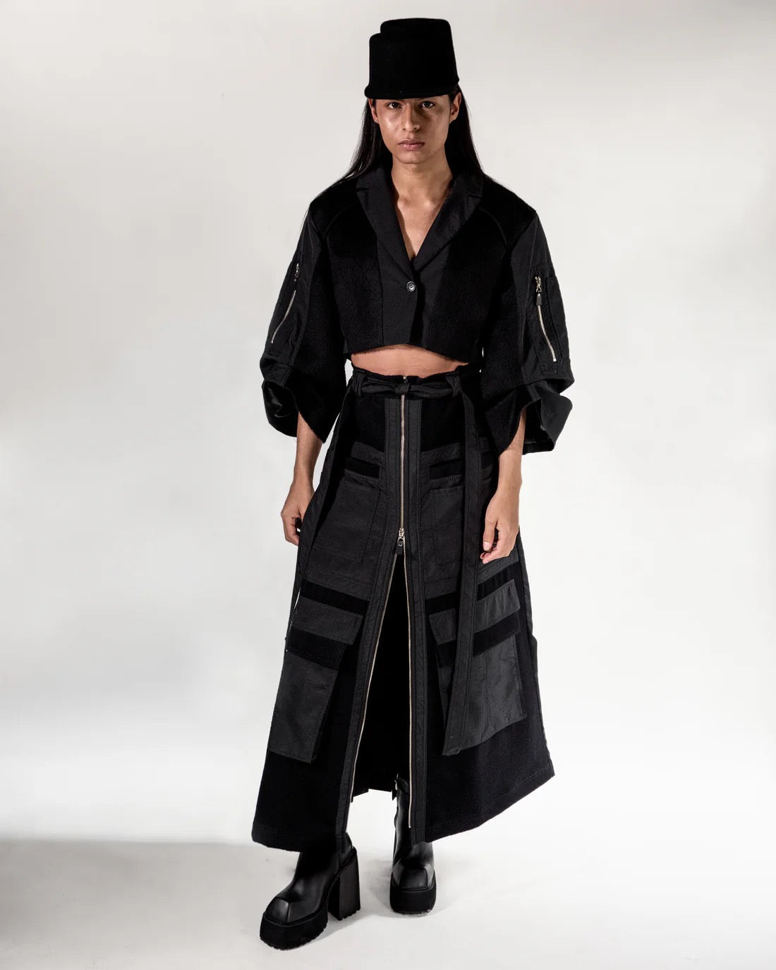 Inspired by the shapes created in the fields from the perspective of modern maps, this skirt made of cloth and taffeta, has a pleated back, derived from the traditional pleated silhouette of the Colombian peasant skirt.