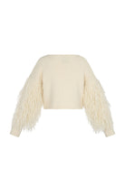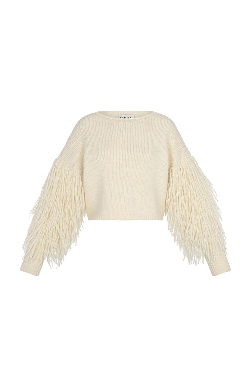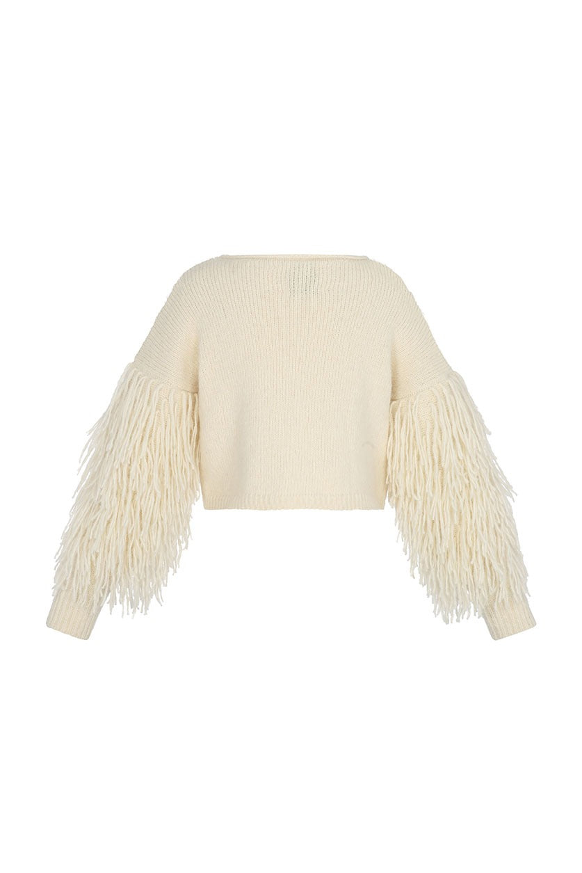 Introducing the Anemona sweater, a soft textured style with a semi-swept cut, featuring fringe details on all sleeves.