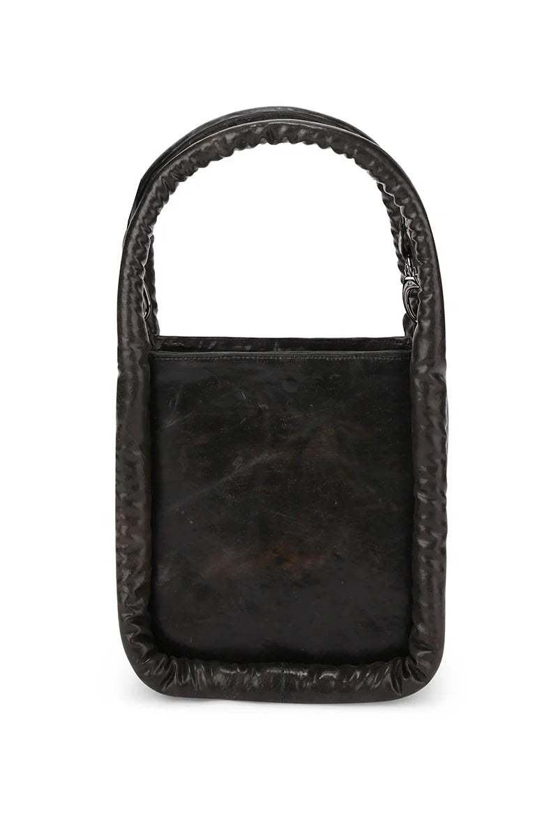 The Toki Wild bag is crafted from shiringa, a natural latex drawn from the Amazon, celebrated for its resilience and organic character. Defined by a rectangular silhouette with integrated handles and an adjustable shoulder strap, the design balances structure with raw materiality.