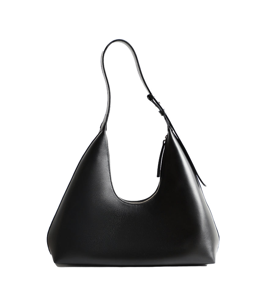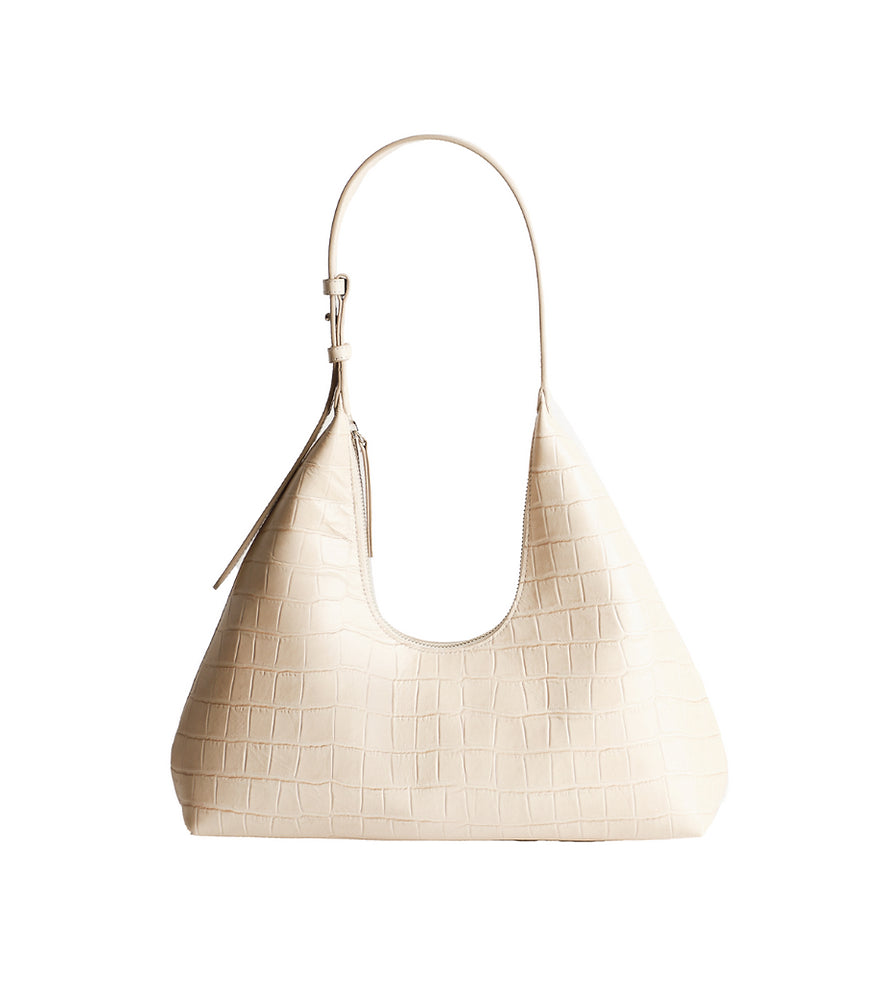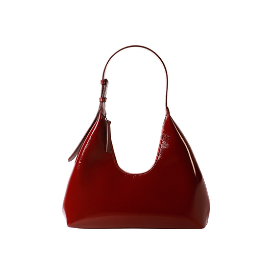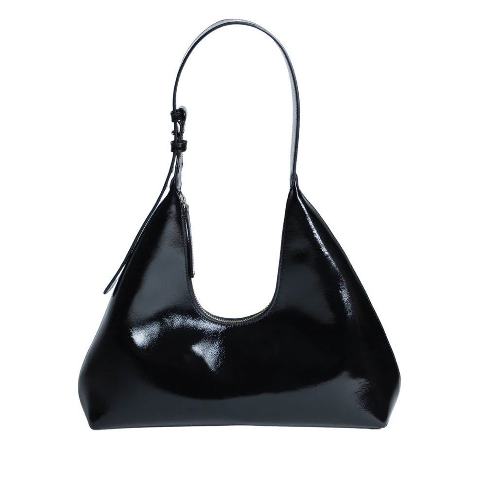 Bolso tipo hobo en forma triangular. Cierre metálico y asa ajustable. Forro sintético