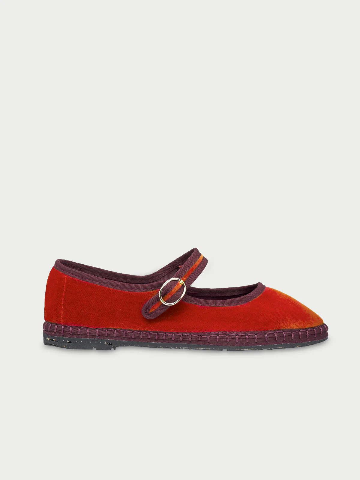 - Merceditas de terciopelo en rojo/naranja con ribetes burdeos y cierre de hebilla.
